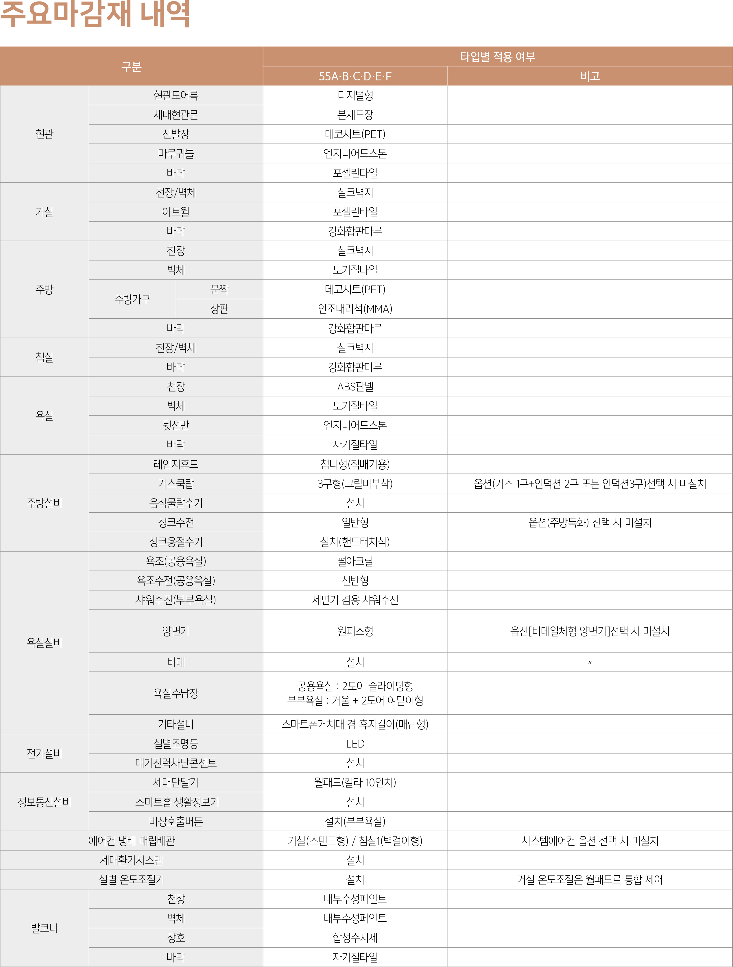 ※ 적용된 마감재는 성능향상을 위하여 설치물의 변경 또는 형태의 변경이 있을수 있고, 유사색상 및 무늬를 지닌 동등이상의 성능을 가진 제품으로 대체시공되거나 생산업체의 부도 및 관계법령 등에 저촉될 경우 동등 이상의 제품으로 변경될 수 있습니다.